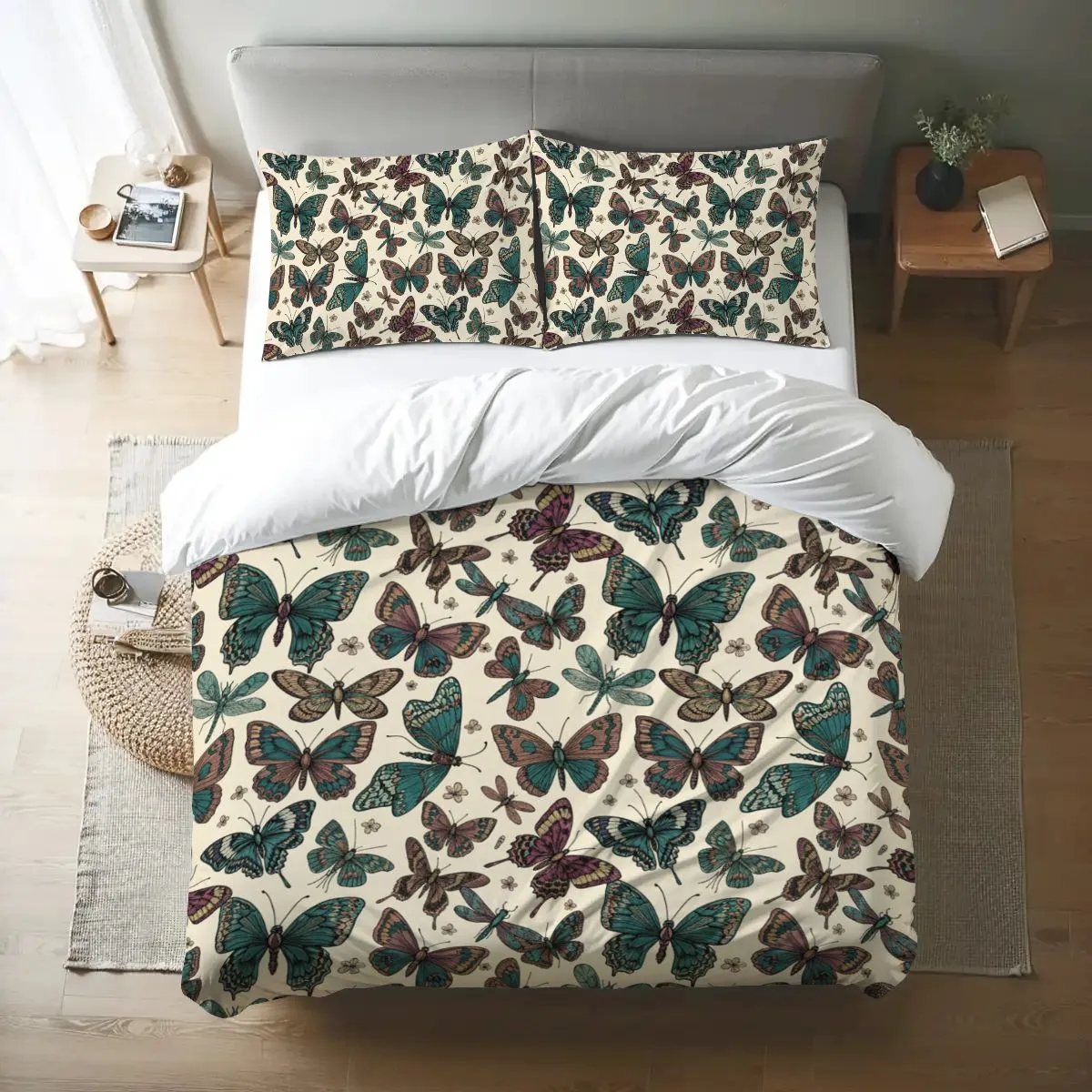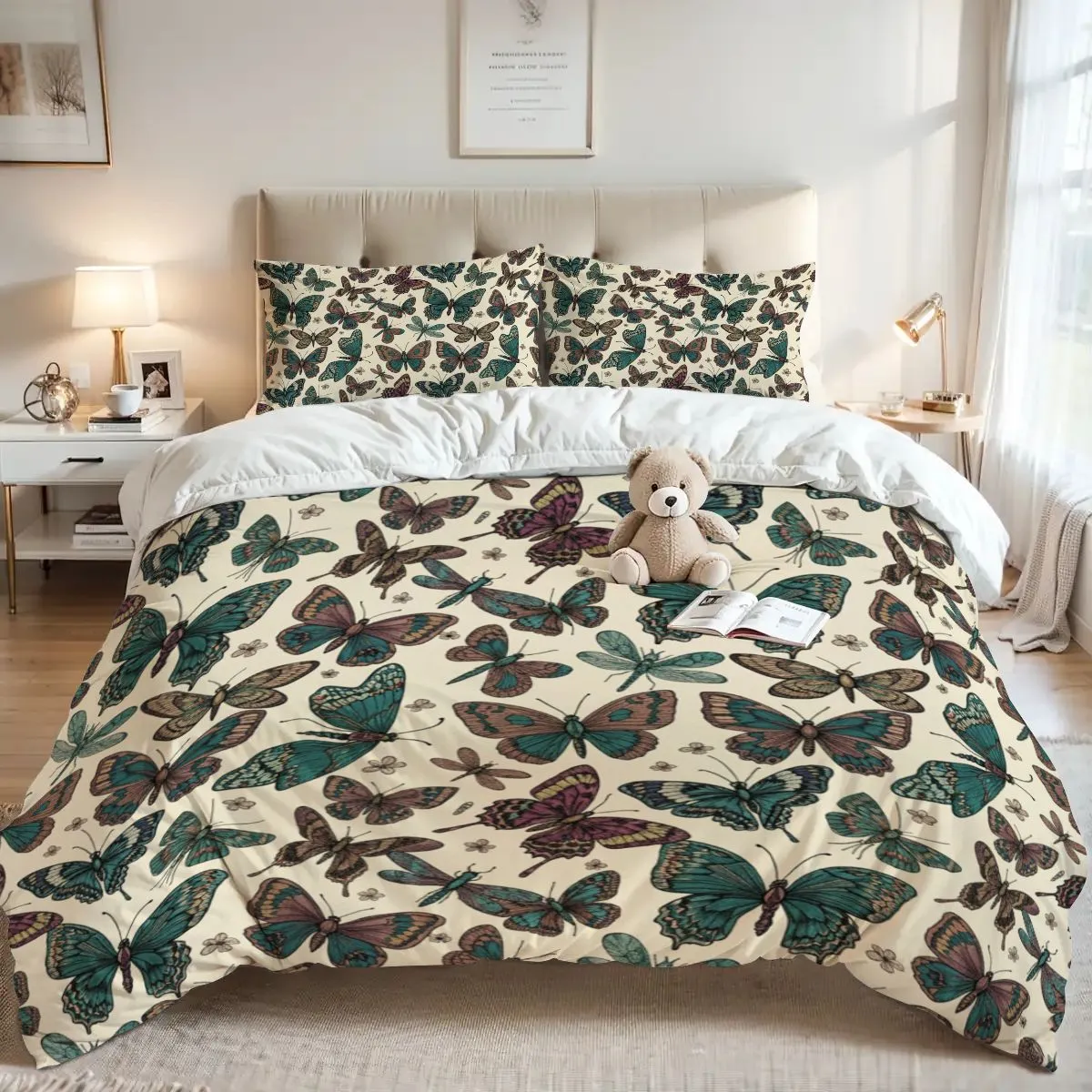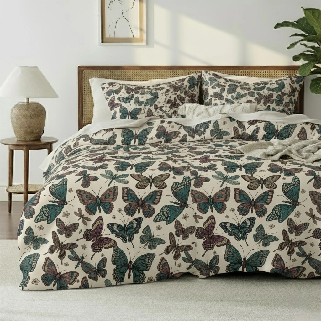 The cream-colored base is adorned with detailed butterfly illustrations in shades of teal, purple, and brown, creating a lively yet sophisticated bedroom centerpiece. A hidden zipper closure ensures convenience and a neat look, while eco-friendly, fade-resistant dyes keep the design vibrant over time.