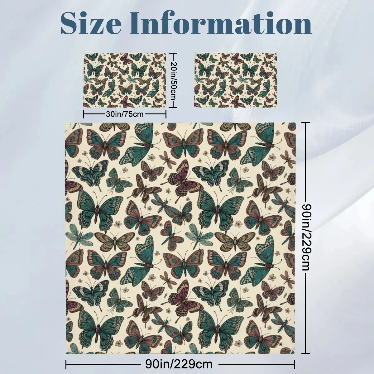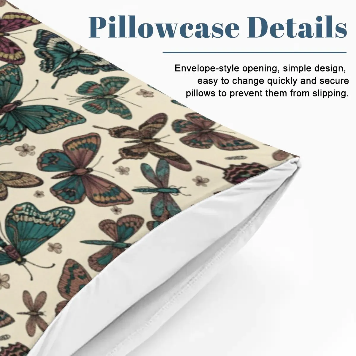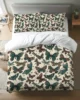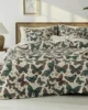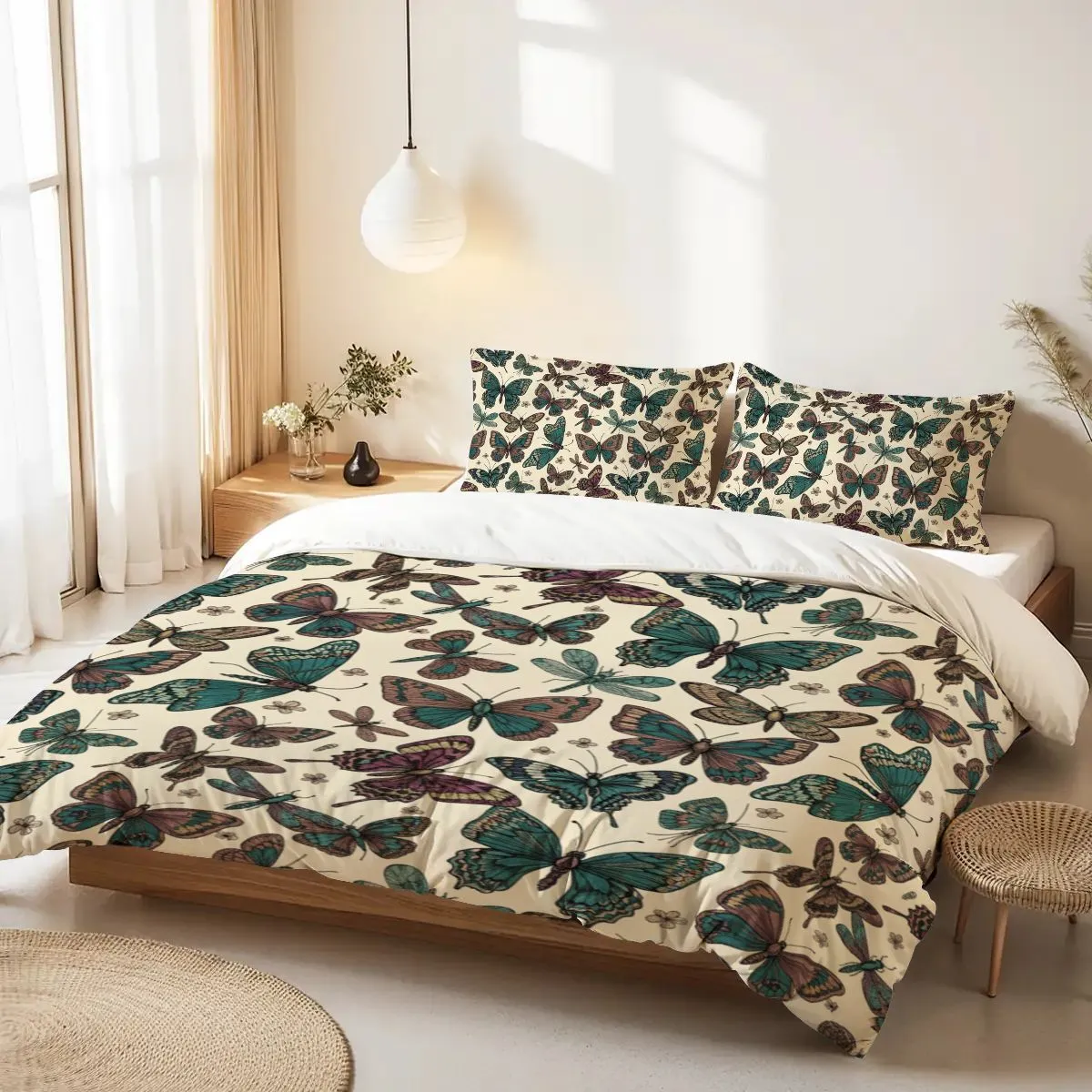 The cream-colored base is adorned with detailed butterfly illustrations in shades of teal, purple, and brown, creating a lively yet sophisticated bedroom centerpiece. A hidden zipper closure ensures convenience and a neat look, while eco-friendly, fade-resistant dyes keep the design vibrant over time.