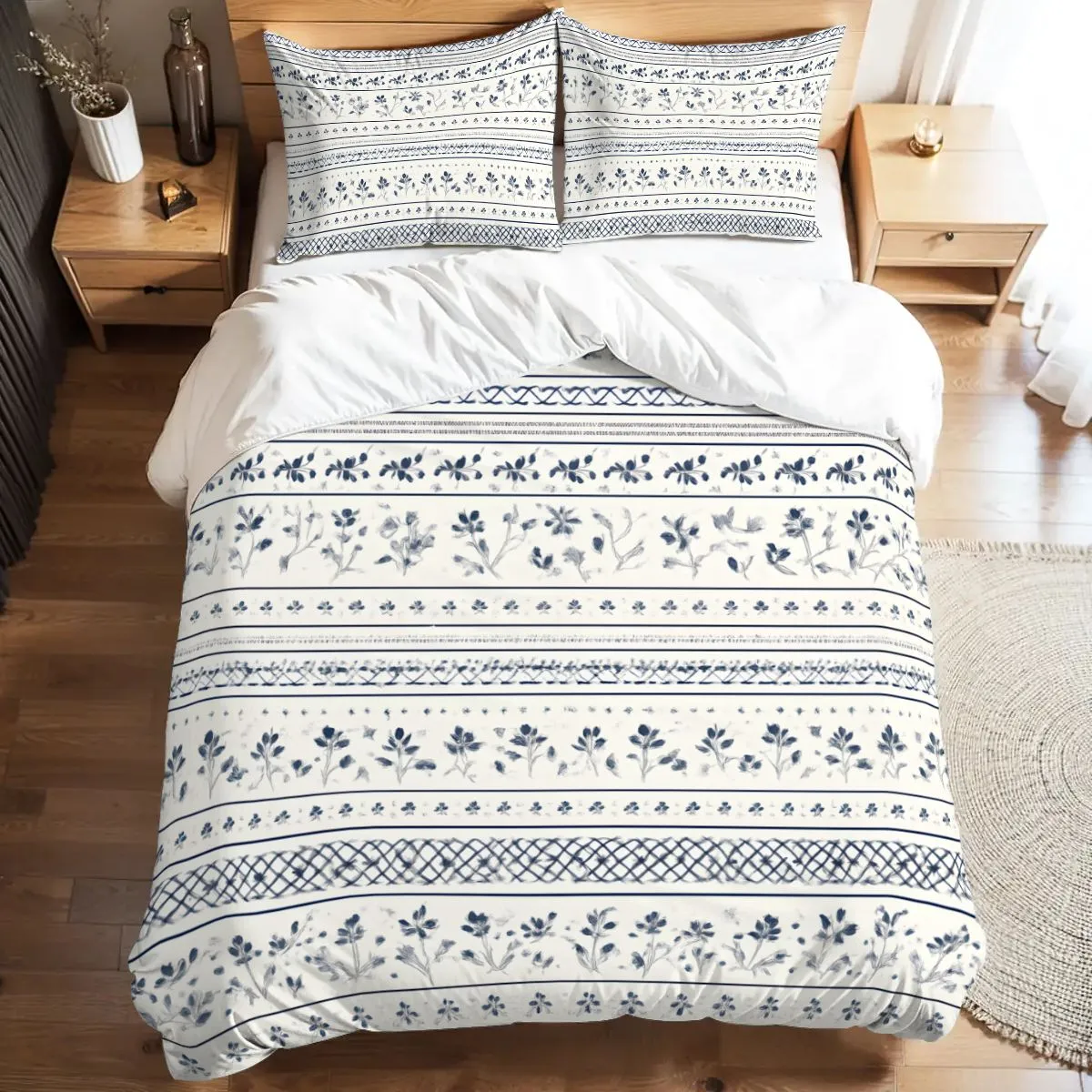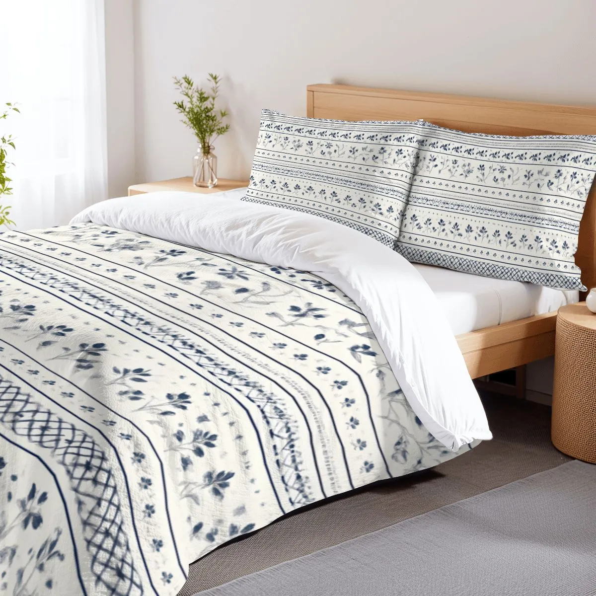 Full Duvet Cover Set – Striped Floral Bedding with Pillowcases
