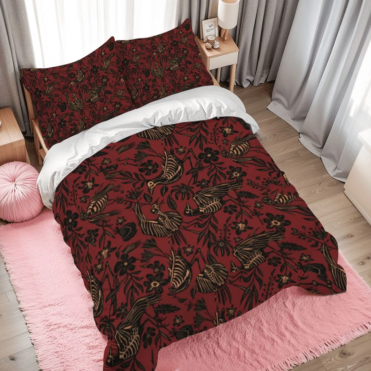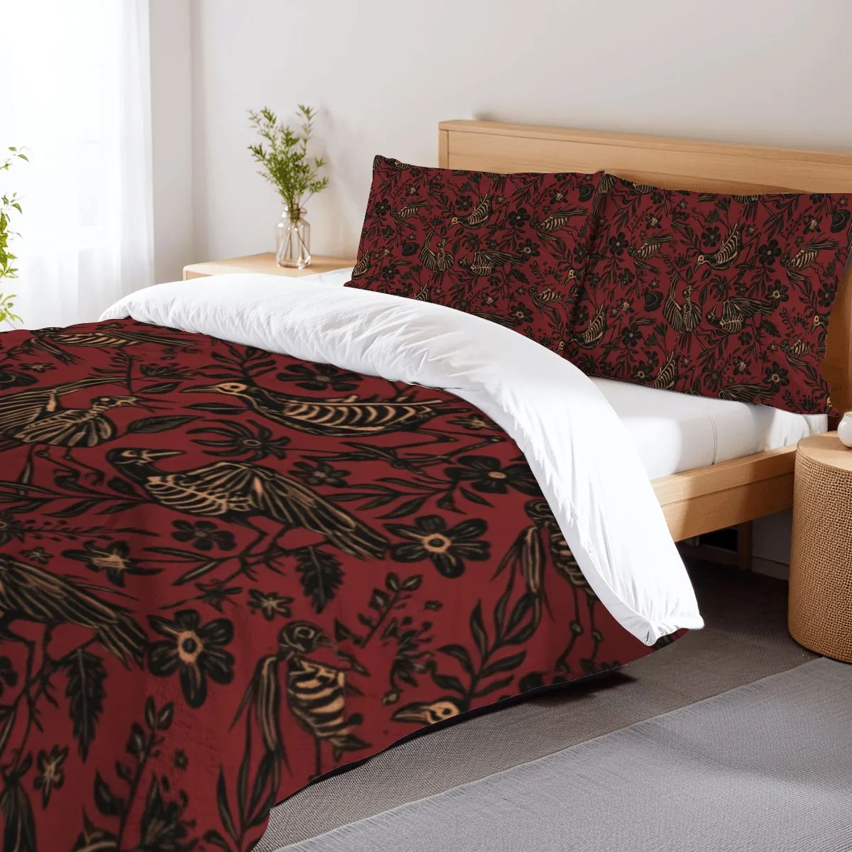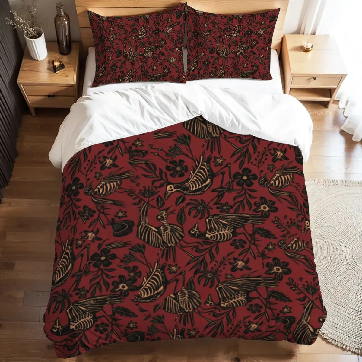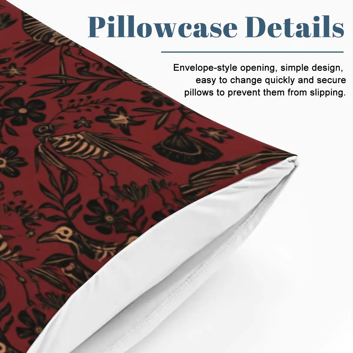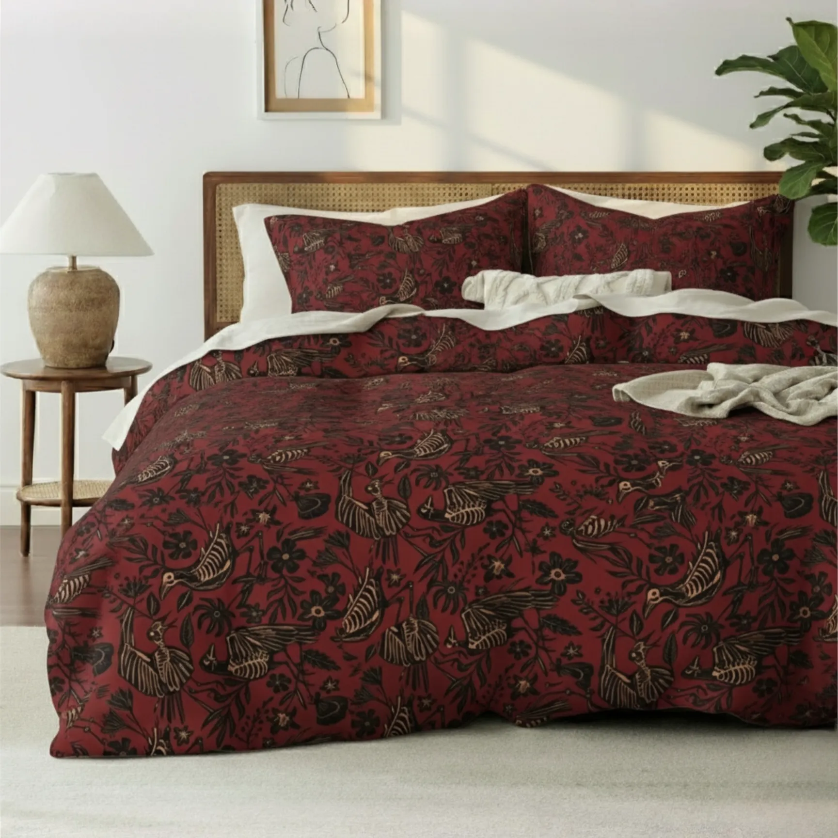 The striking red background with intricate black bird and floral designs creates a bold and artistic look, adding sophistication to any bedroom setting. A hidden zipper closure ensures a sleek finish and easy use, while the fade-resistant fabric keeps the design vibrant after multiple washes.